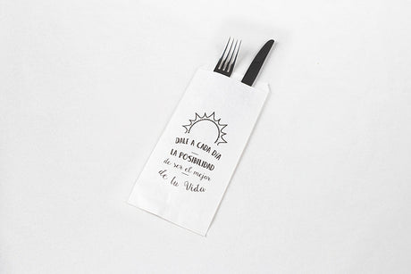 Bolsa Papel Portacubiertos 11x24cm Blanco Deco. Frases, 1.000uds